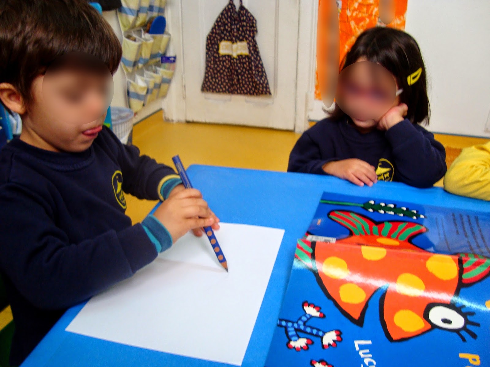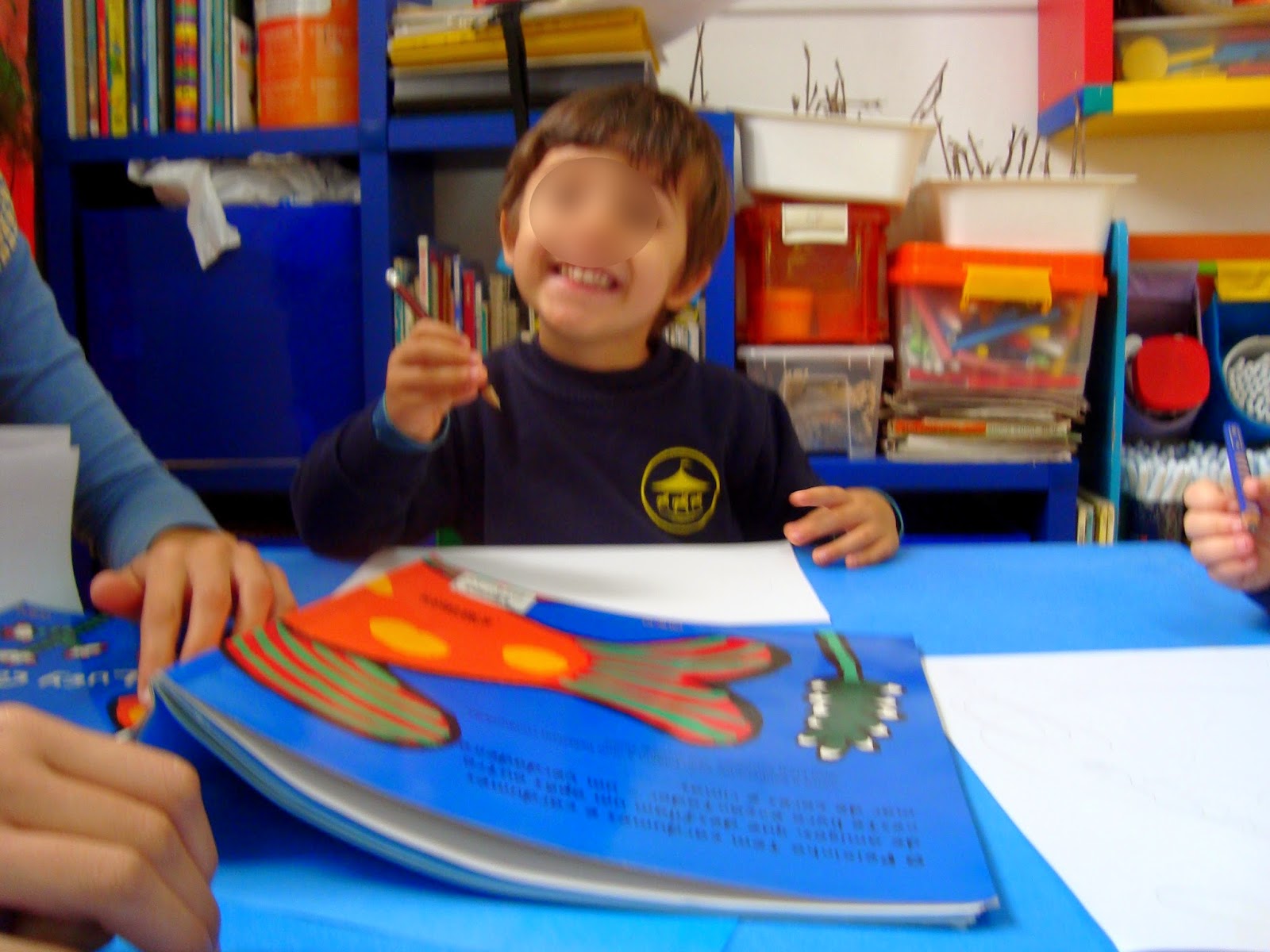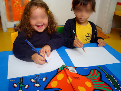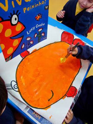 Esta é uma história que nos tem acompanhado nas últimas semanas e que nos permitiu trabalhar diferentes conteúdos (cores, contagem, representação gráfica, etc). Começámos por decidir representar o peixinho e a mãe peixe que aparecem na história, mas quisemos incluir também o pai peixe! Também tomámos contacto com a palavra CARDUME...